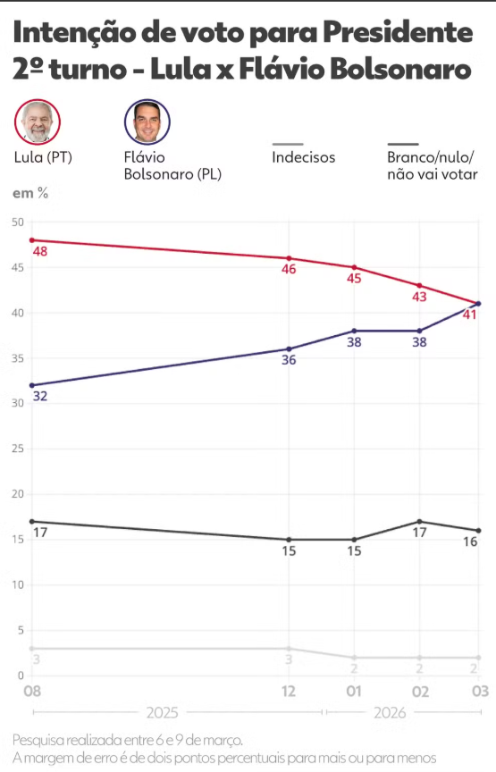 O cenário para a corrida presidencial de 2026 acaba de registrar um marco inédito. A pesquisa Quaest divulgada nesta quarta-feira (11) aponta que, em um eventual segundo turno, o presidente Lula (PT) e o senador Flávio Bolsonaro (PL) estão empatados numericamente, ambos com 41% das intenções de voto. De fato, a série histórica mostra uma trajetória de ascensão do senador e de desgaste do atual mandatário, mesmo com seus programas sociais. O que segundo especialistas sinalizam que possivelmente a comunicação do Planalto não tem sido eficiente., deixando que a direita assuma o protagonismo das narrativas. Fato é que, a diferença a favor de Lula era de dez pontos; em janeiro caiu para sete; em fevereiro chegou a cinco e, agora, a vantagem foi totalmente diluída.
